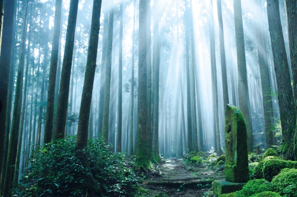 古道石板、参天杉木、山雾缭绕,是熊野最有“神域感”的路段。
