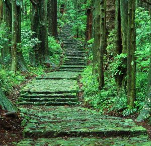 石畳、杉林、山霧に包まれた道は、